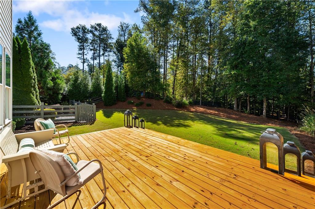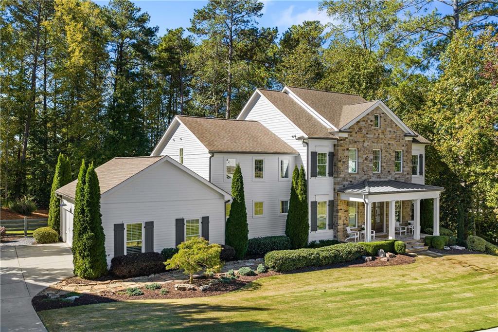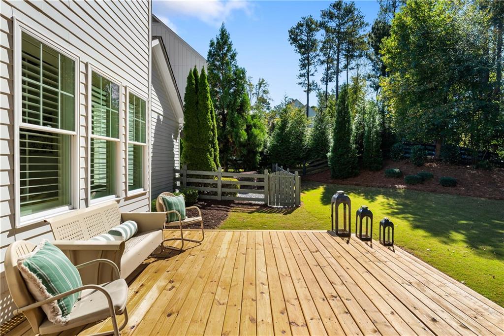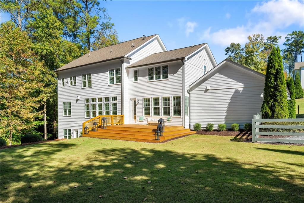 Set on a private acre in Milton's coveted Highgrove community, this 5-bedroom, 5.5-bath farmhouse retreat effortlessly blends timeless charm with modern sophistication. The main floor impresses with soaring 10-foot ceilings, creating an open and airy ambiance throughout. At the heart of the home, the gourmet kitchen features beamed ceilings, double ovens, abundant cabinetry, and a spacious island with seating for four. A walk-in pantry offers exceptional storage, while the adjoining breakfast area opens to a brand-new deck overlooking the private, wooded backyard. The fireside family room flows seamlessly from the kitchen, enhanced by plantation shutters, shiplap, and custom trim for a warm yet refined feel.