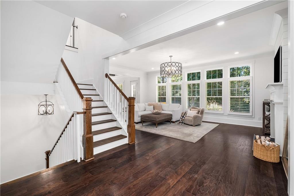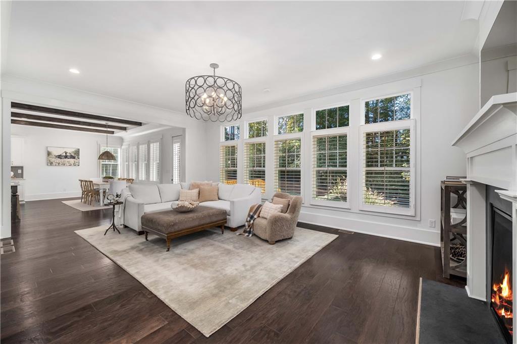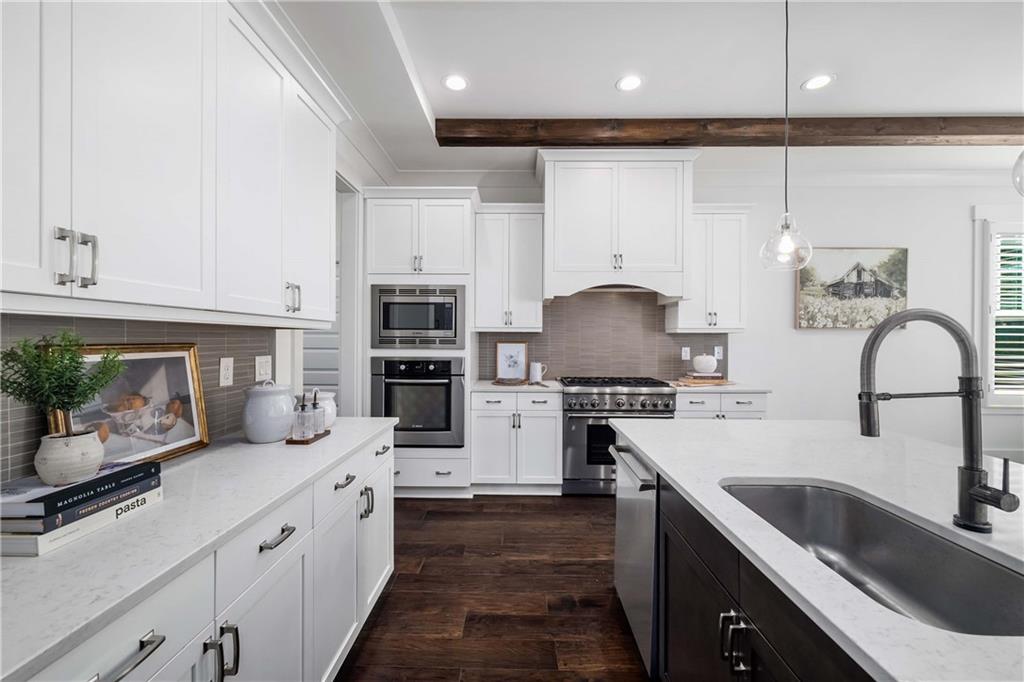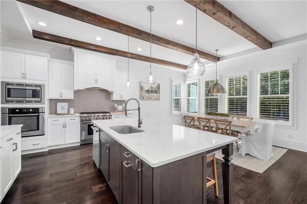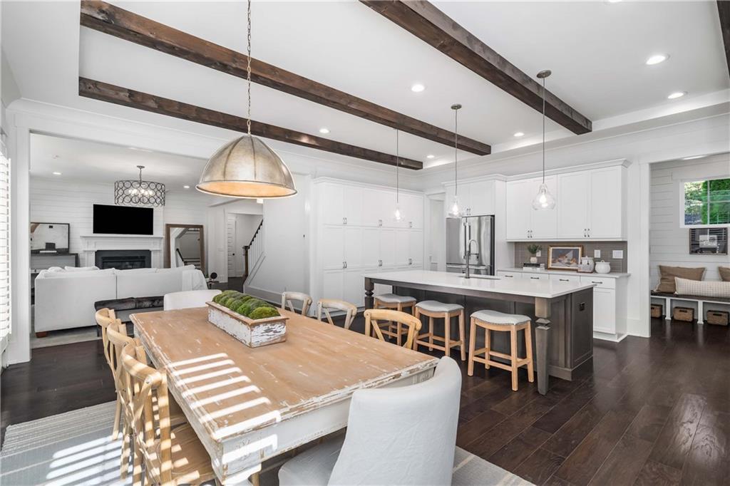 Set on a private acre in Milton's coveted Highgrove community, this 5-bedroom, 5.5-bath farmhouse retreat effortlessly blends timeless charm with modern sophistication. The main floor impresses with soaring 10-foot ceilings, creating an open and airy ambiance throughout. At the heart of the home, the gourmet kitchen features beamed ceilings, double ovens, abundant cabinetry, and a spacious island with seating for four. A walk-in pantry offers exceptional storage, while the adjoining breakfast area opens to a brand-new deck overlooking the private, wooded backyard. The fireside family room flows seamlessly from the kitchen, enhanced by plantation shutters, shiplap, and custom trim for a warm yet refined feel.