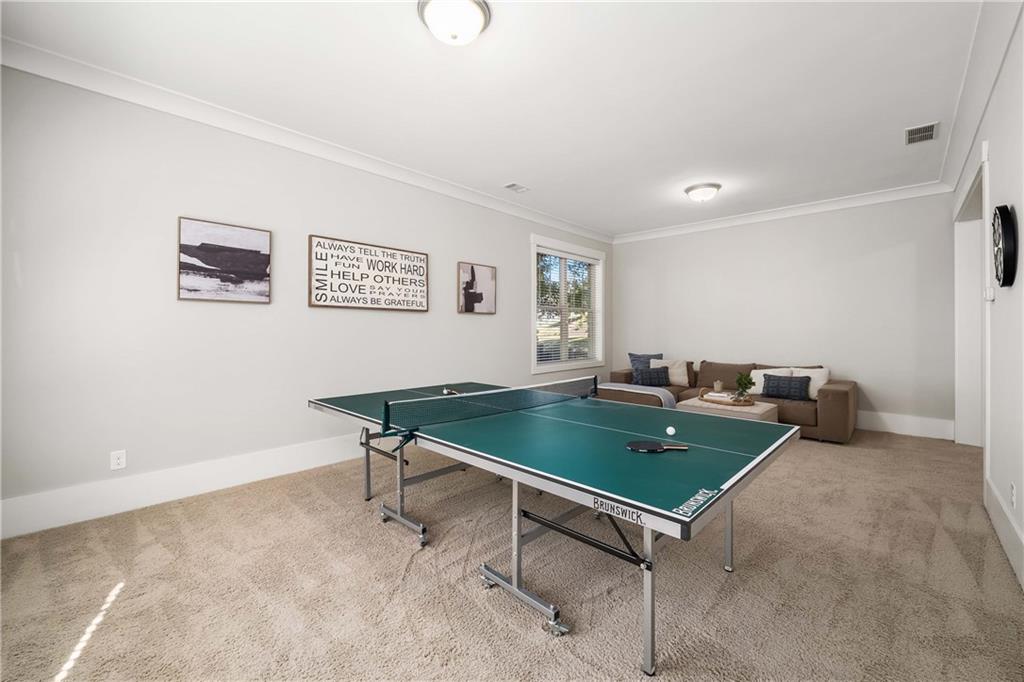 The terrace level, with 9-foot ceilings, expands the living space with a versatile bonus room and generous unfinished areas, perfect for storage or future customization. Additional highlights include wood moldings, an irrigation system, and a neighborhood complete with sidewalks and streetlights. Recent upgrades include a whole-home water filtration system (2025), whole-home surge protector with warranty (2024), a new back deck, and two HVAC units replaced within the past five years.